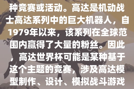 高达世界杯,通常指的是与高达这个知名动画系列相关的某种竞赛或活动。高达是机动战士高达系列中的巨大机器人,自1979年以来,该系列在全球范围内赢得了大量的粉丝。因此,高达世界杯可能是某种基于这个主题的竞赛,涉及高达模型制作、设计、模拟战斗游戏或与高达主题相关的其他活动。