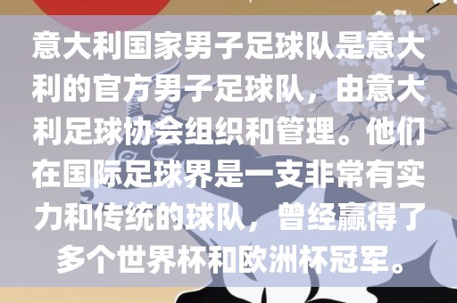 意大利国家男子足球队是意大利的官方男子足球队,由意大利足球协会组织和管理。他们在国际足球界是一支非常有实力和传统的球队,曾经赢得了多个世界杯和欧洲杯冠军。