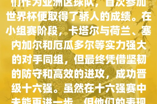 关于卡塔尔在2022年世界杯的表现,可以说是非常出色的。他们作为亚洲区球队,首次参加世界杯便取得了骄人的成绩。在小组赛阶段,卡塔尔与荷兰、塞内加尔和厄瓜多尔等实力强大的对手同组,但最终凭借坚韧的防守和高效的进攻,成功晋级十六强。虽然在十六强赛中未能更进一步,但他们的表现已经赢得了球迷和对手的尊重。