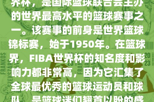 FIBA世界杯,也被称为篮球世界杯,是国际篮球联合会主办的世界最高水平的篮球赛事之一。该赛事的前身是世界篮球锦标赛,始于1950年。在篮球界,FIBA世界杯的知名度和影响力都非常高,因为它汇集了全球最优秀的篮球运动员和球队,是篮球迷们翘首以盼的盛事之一。