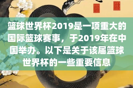 篮球世界杯2019是一项重大的国际篮球赛事,于2019年在中国举办。以下是关于该届篮球世界杯的一些重要信息