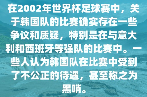 在2002年世界杯足球赛中,关于韩国队的比赛确实存在一些争议和质疑,特别是在与意大利和西班牙等强队的比赛中。一些人认为韩国队在比赛中受到了不公正的待遇,甚至称之为黑哨。