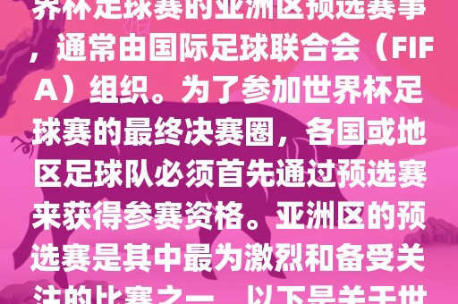 世界杯亚洲区预选赛是FIFA世界杯足球赛的亚洲区域选拔赛,由国际足球联合会组织。为了获得世界杯参赛资格,各国或地区足球队需通过激烈的预选赛竞争。亚洲区的预选赛备受关注,是世界上最具竞争性和关注的比赛之一。
